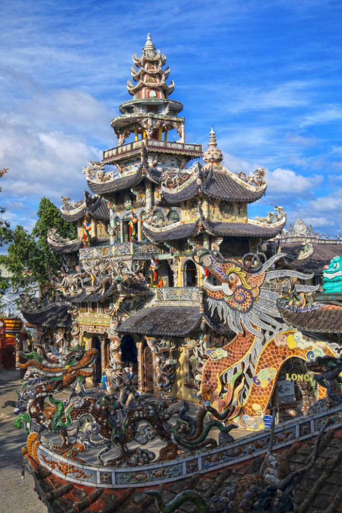 Полностью выполнен из мозаики: миллионы осколков стекла, величественная Гуаньинь, колокол желаний и знаменитые драконы из бутылок. Мощная энергетика, масштаб и одна из самых необычных святынь Вьетнама.
